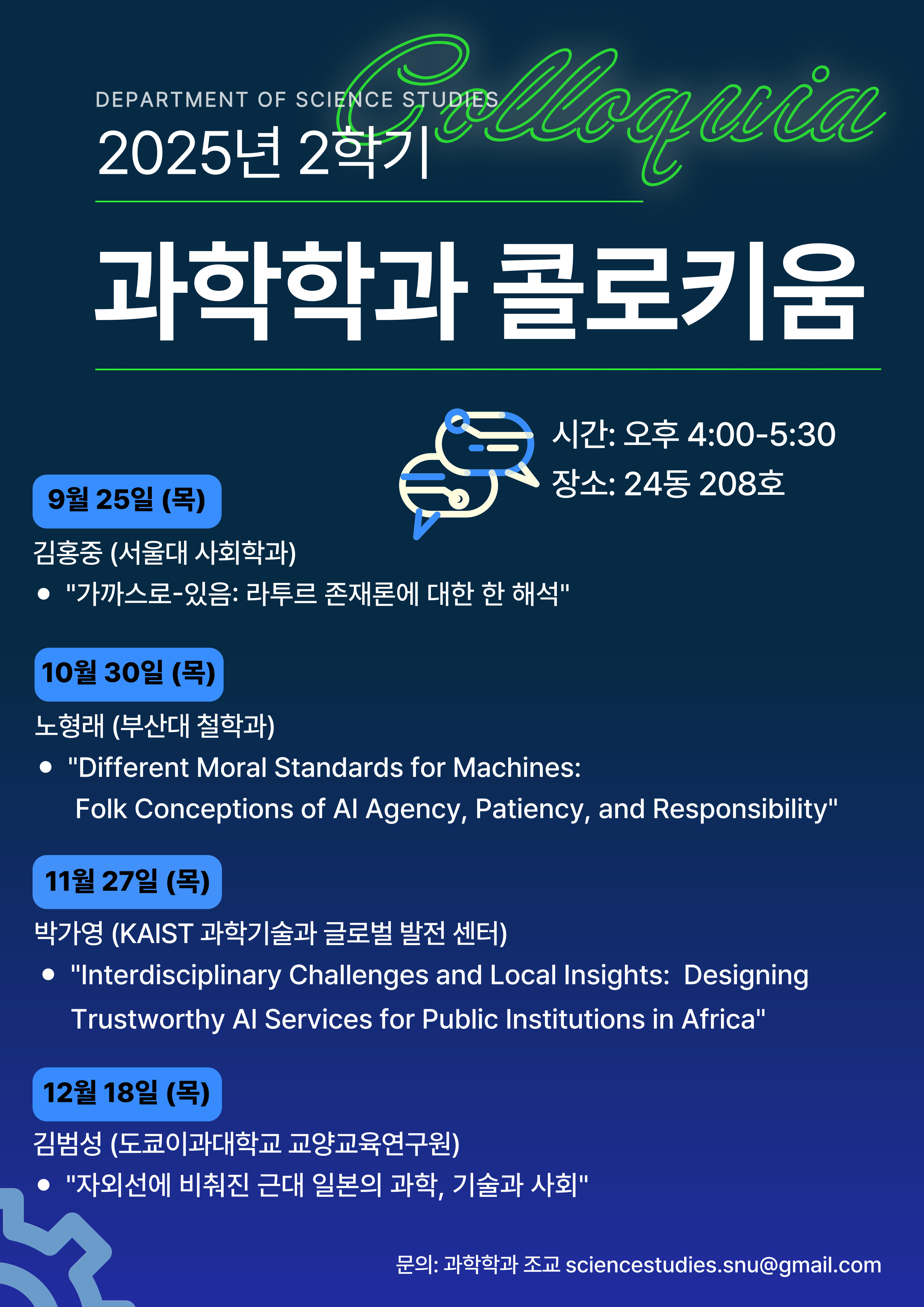 11월 17일 (월), 11월 24일(월) 특별콜로키움, 12월 10일(수) 내부세미나 외의 모든 행사는 목요일에 진행됩니다.