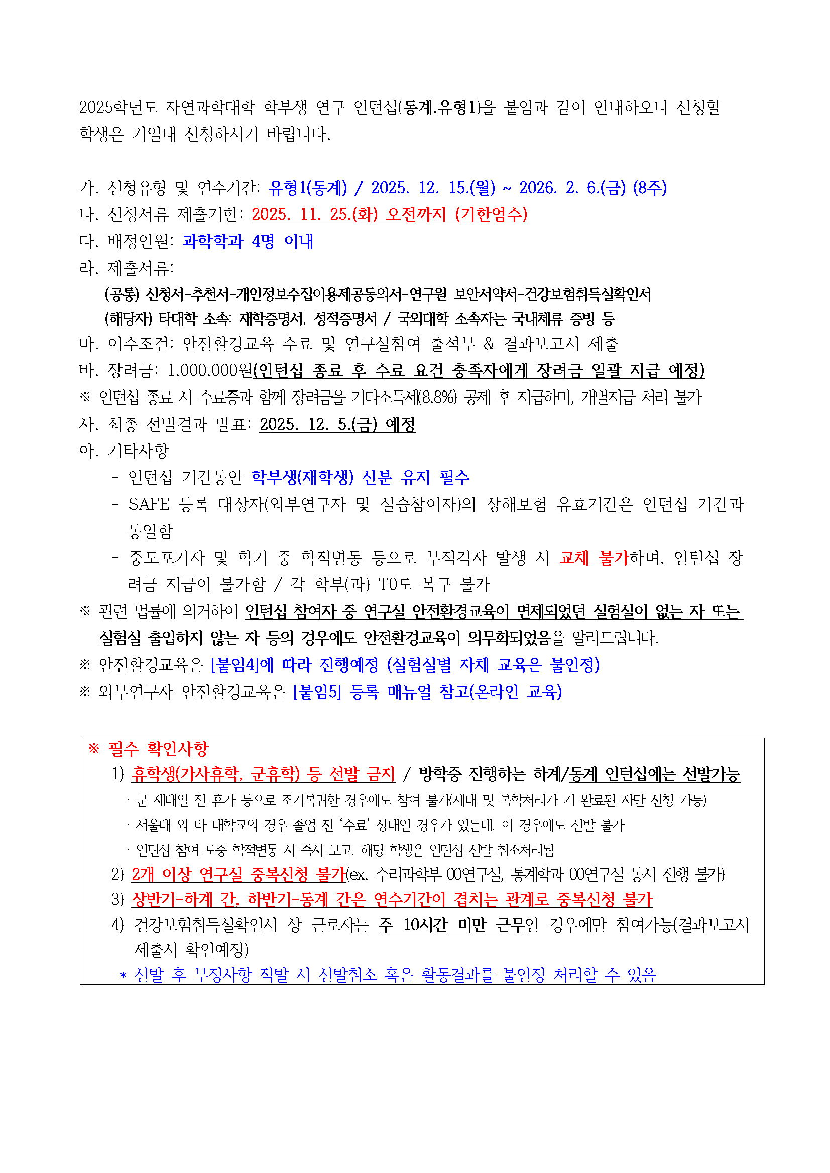 2025학년도 자연과학대학 학부생 연구인턴십(동계, 유형1)을 붙임과 같이 안내하오니 관심있는 분께서는 적극 참여하여 주시기 바랍니다.